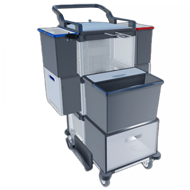 The Shopster Des Tub is ideal equipment for disinfectant cleaning in clinics and doctor's offices. This cart features a dosing system (Des Tub) and uses a double-sided 30 cm Twix mop system. The mops are transportable in a push-along box; rotating boxes and a bucket provide space for color-coded cloths for surface cleaning.