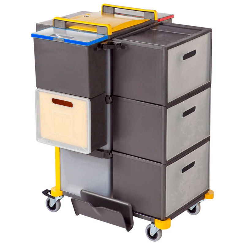 The Shopster Pre-Prep is particularly narrow and fits through any conventional door. Thanks to the drawer boxes and buckets, it has plenty of space for storing and disposing of prepared textiles (mops and cloths). It is also ideal for storing supplies.