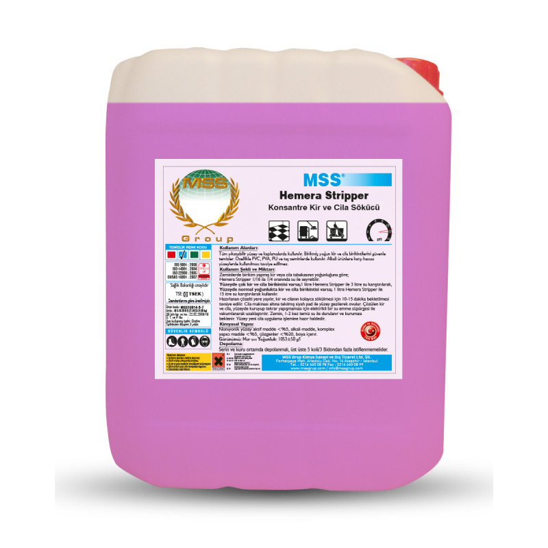Used on all washable surfaces and coatings. Particularly suitable for PVC, PVA, PU, and stone floors. Not recommended for use on surfaces sensitive to alkaline products. (For alkali-sensitive surfaces such as linoleum and rubber, it is recommended to use Hemera Stripper – L as a dirt and polish remover.)