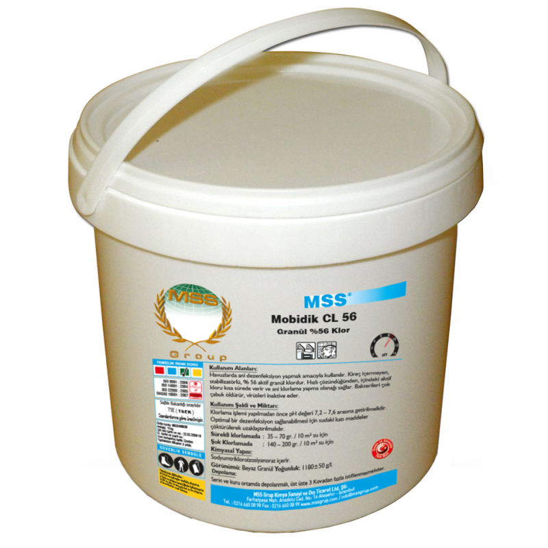 MOBIDIK CL-56 is a stabilized granular chlorine containing 56% active chlorine, formulated for rapid disinfection (shock chlorination) and regular cleaning in pools. Thanks to its fast-dissolving structure, it releases active chlorine as soon as it mixes with water and acts immediately on microorganisms.