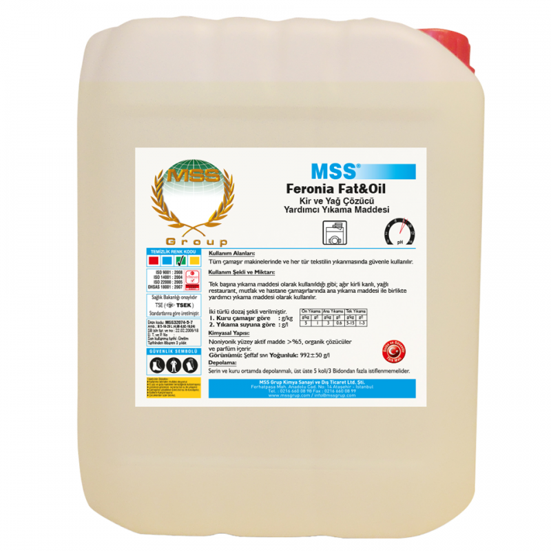FERONİA Fat&Oil, endüstriyel çamaşırhanelerde özellikle yağ bazlı zorlu kirlilikleri temizlemek amacıyla formüle edilmiş, yüksek performanslı sıvı bir yardımcı yıkama maddesidir. Su sertliğinden etkilenmeyen yapısı ve doku dostu formülü sayesinde en nazik çamaşırlarda dahi mükemmel temizlik sağlar.